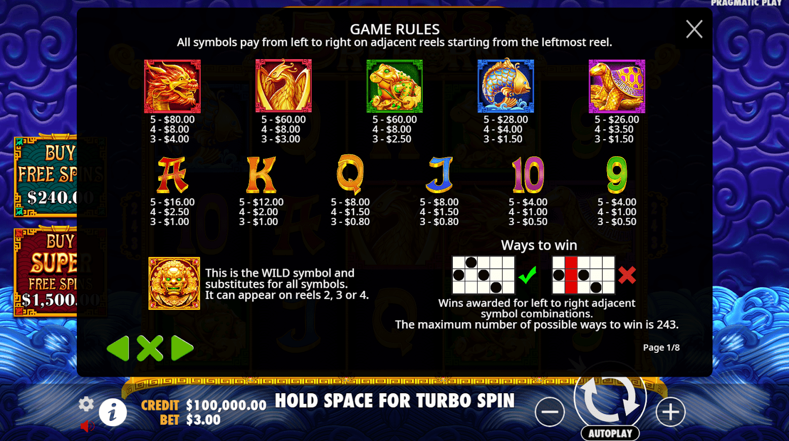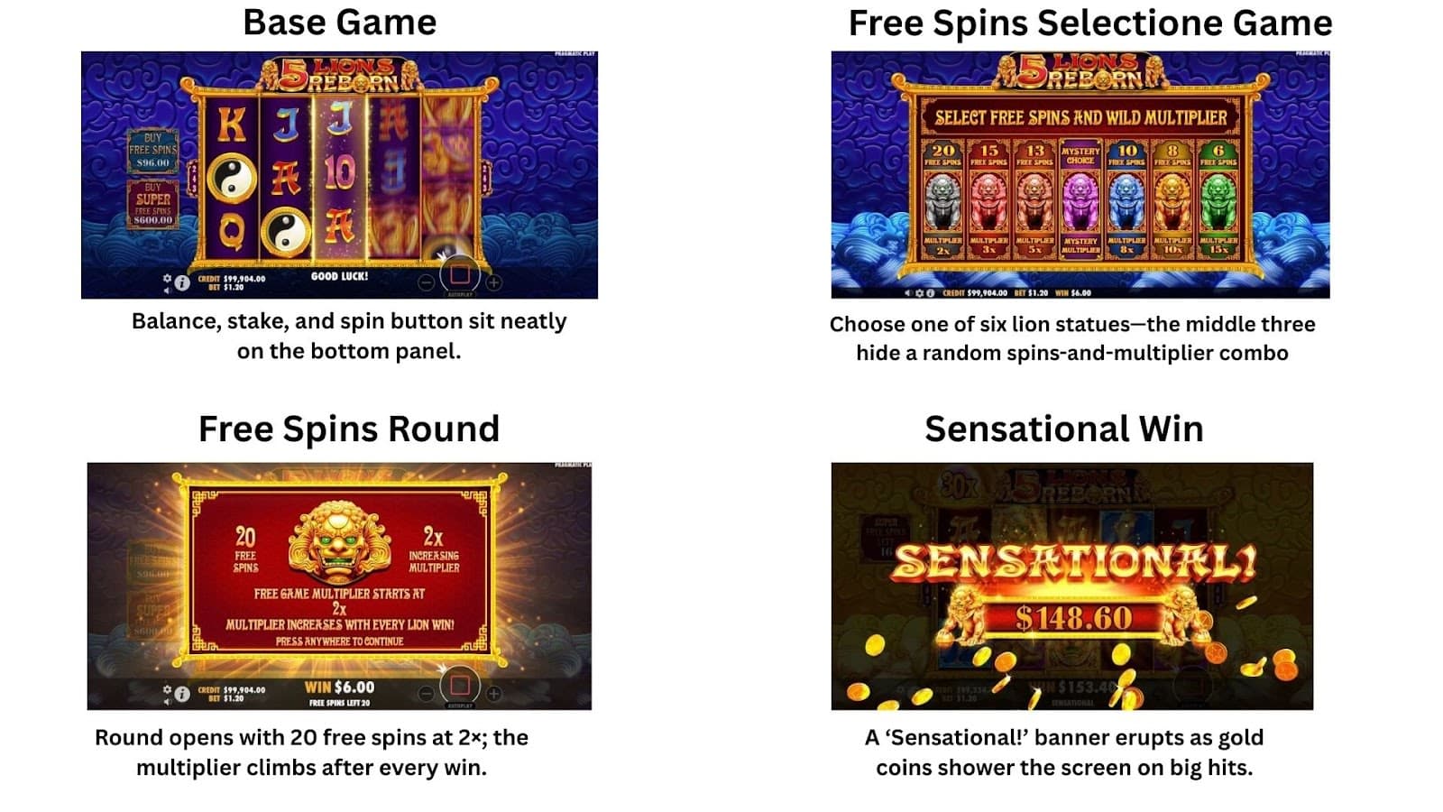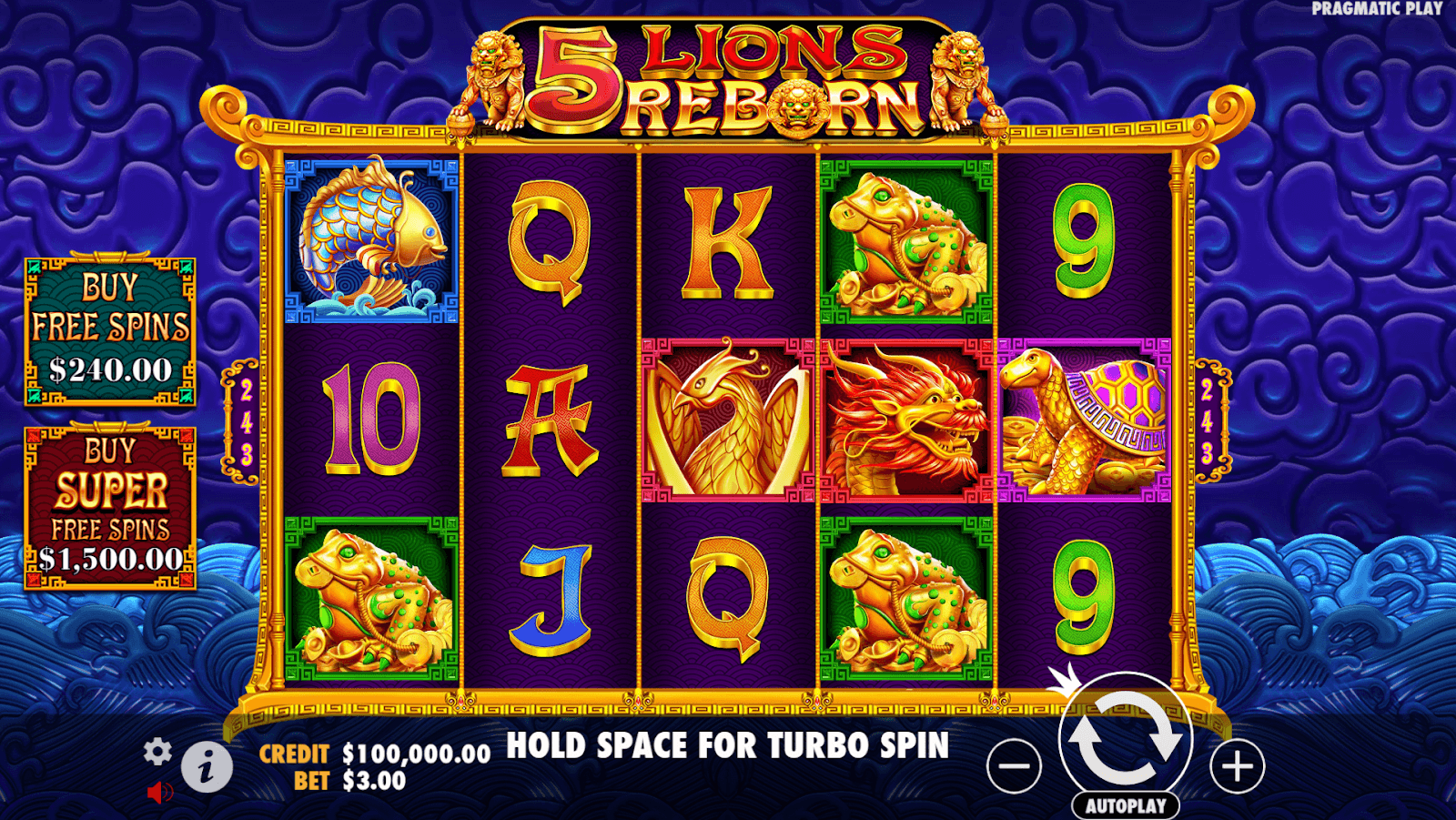 5 Lions Rebornは、華やかな金色のフィリグリーにフェニックス、カメ、鯉のシンボルが輝くヒスイの寺院を中心に、豊かで詳細なグラフィックが特徴です。微妙な粒子のフレアと光のバーストが、伝統的な中国の美学を損なうことなく、洗練されたダイナミックな雰囲気を醸し出しています。